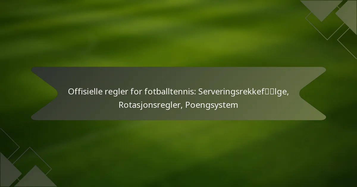 Fotballtennis kombinerer elementer fra fotball og tennis, og spilles på en bane der spillerne bruker føttene til å slå en ball over et nett. Spillet følger spesifikke regler angående serve-rekkefølge, rotasjon og poenggiving, noe som sikrer rettferdig spill og konkurranse. Å forstå disse reglene er essensielt for å opprettholde rettferdighet og forbedre spilldynamikken.